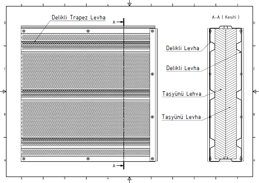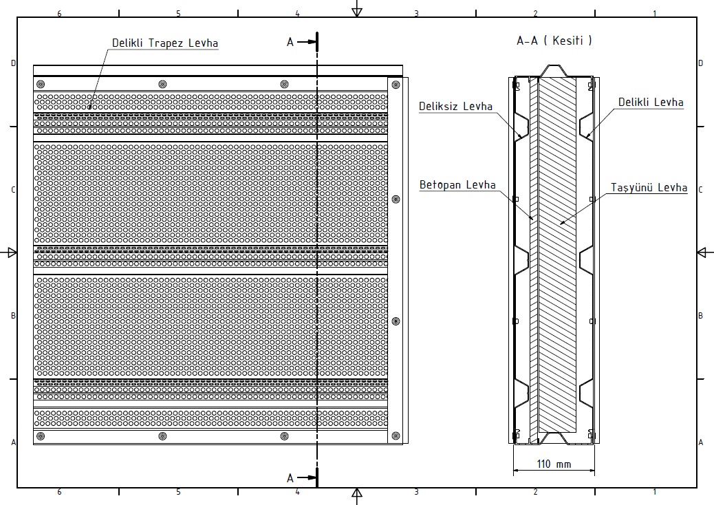 500 mm yüksekliğinde, 133 mm kalınlığında ve farklı uzunluklarda üretilebilen, bir tarafı delikli, bir tarafı deliksiz alüminyum trapez levha ve rasına yerleştirilmiş yüksek yoğunluklu, ses emici tek tarafı siyah camtülü kaplı taş yünü levha ve betopan levhadan mamul, tek tarafı ses emici alüminyum gürültü bariyeri